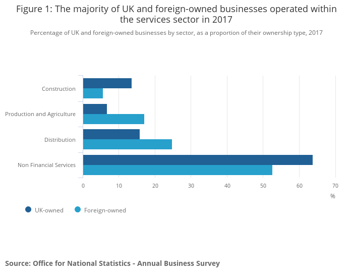 Figure 1: The majority of UK and foreign-owned businesses operated within the services sector in 2017