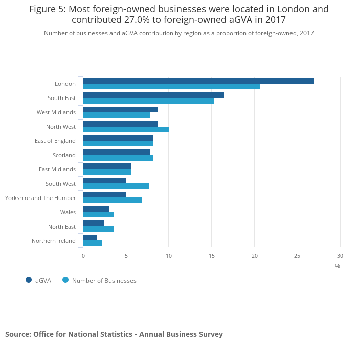 Figure 5: Most foreign-owned businesses were located in London and contributed 27.0% to foreign-owned aGVA in 2017
