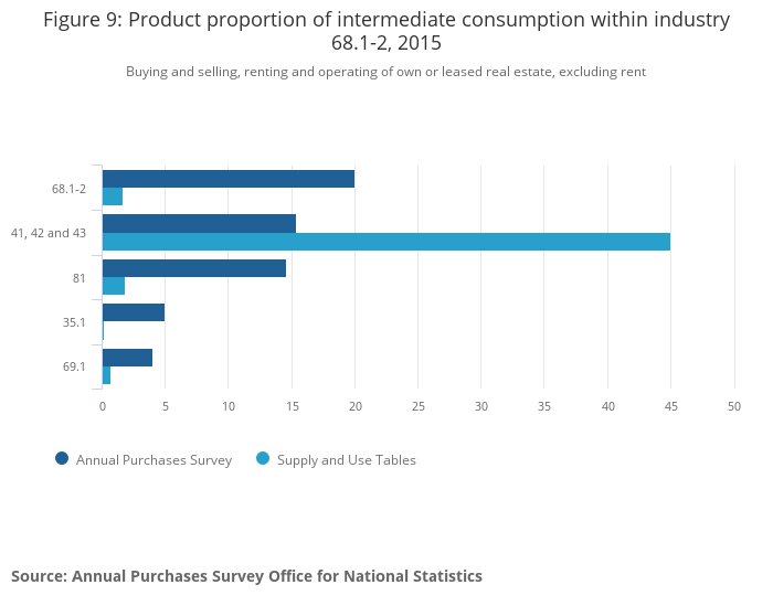 Figure 4 shows the top 15 products making up the highest proportions of total intermediate consumption from the Annual Purchases Survey compared with the current SUTs. It shows the highest proportion of purchased products, based on the APS, was in construction (8.4% of total intermediate consumption).