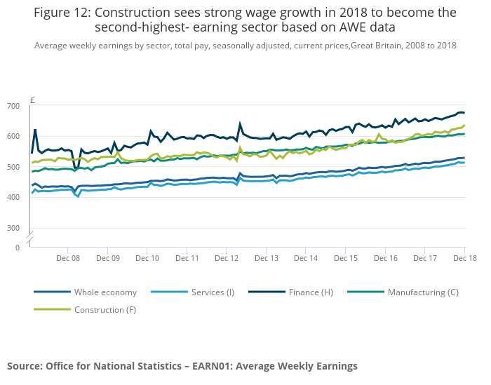Average weekly earnings in the construction industry in Great Britain continued to recover from a fall in 2016, increasing to £635.66 per week in December 2018, second only to the finance and business services sector.