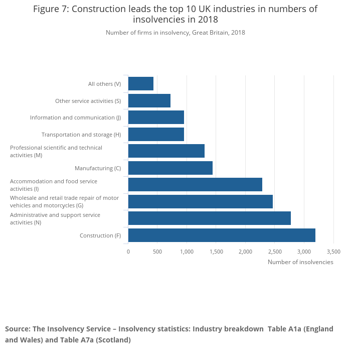 The volatile nature of the construction industry is evident in the number of insolvencies seen within the industry. According to data from The Insolvency Service, there was a total of 16,578 new company insolvencies across the top 10 industries in Great Britain in 2018.
