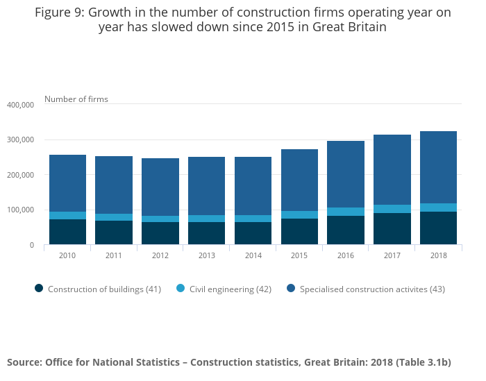 The number of construction firms operating in the construction industry has continued to rise – reaching its highest level on record – with 325,736 registered firms operating in Great Britain in 2018, increasing by 11,146 (3.5%) compared with the previous year.