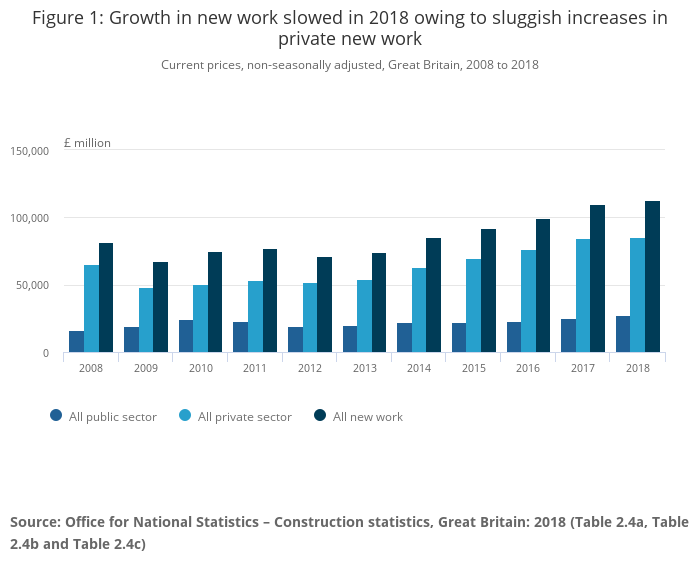 Image .csv .xlsThe value of all new work increased by 3.1% in Great Britain in 2018, growing to £113,127 million; this is the highest level in this series since records began. However, this represents the lowest annual growth in new work since 2012, which saw a year-on-year decline of 7.9%. The growth seen in 2018 was driven primarily by increases in public new work, which increased by 10.8%, the fastest growth rate of public new work since 2010 when it grew by 24.6%. The £2,697 million increase in public new work compares with a £750 million (0.9%) increase in private new work; this is the weakest growth of private new work since 2012 when it fell by 3.4%.
