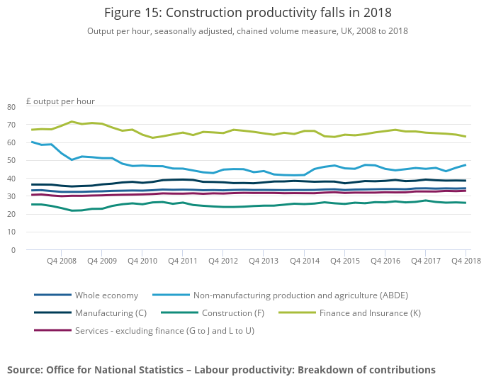 Image .csv .xlsFigure 15 shows labour productivity, measured by output per hour within the whole UK economy, broken down by industry between 2008 and 2018. While whole-economy productivity was flat (0.0%) between Quarter 4 2018 and Quarter 4 2017, productivity declined in several industries, with falls in construction (4.8%), finance and insurance (3.4%), and manufacturing (1.5%). While finance and insurance had a large decline in productivity in 2018, it still remains well above the other industries in terms of productivity. This is shown by the industry recording £63.04 of output per hour in chained volume measure terms in Quarter 4 2018. This is well above the £34.15 of output per hour for the economy as a whole. In the quarter-on-the-same-quarter-a-year-ago series, productivity in the construction industry fell for the first time since Quarter 2 (Apr to June) 2016, to £26.05 of output per hour in Quarter 4 2018. This means construction remains the least productive of these industries in 2018 at 23.7% below the whole-economy Quarter 4 2018 value."