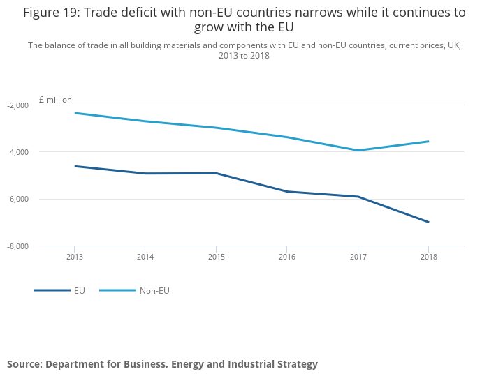 The balance of trade in all building materials and components with EU and non-EU countries, current prices, UK, 2013 to 2018