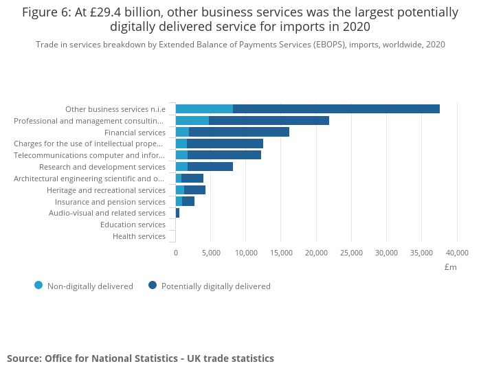 Download this chart Figure 6: At £29.4 billion, other business services was the largest potentially digitally delivered service for imports in 2020