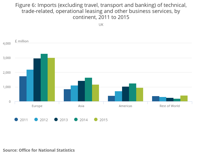 Despite experiencing a decline, Europe remained the largest source for UK imports of trade- related, operational leasing and other business services. Imports of these types of services fell from £3,292 million in 2014 to £3,003 million in 2015. The majority of the decline was seen within the EU; primarily Italy, which declined by £123 million in 2015. This is in contrast to UK exports of these types of services to Italy, which more than trebled in 2015.