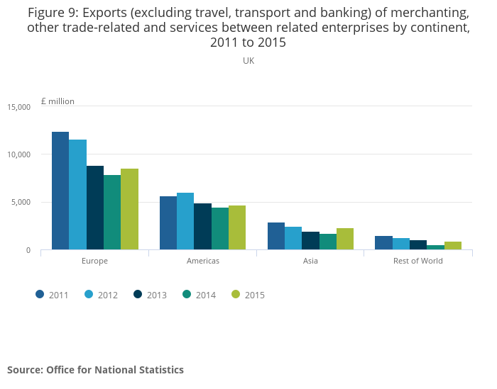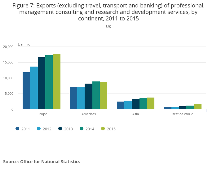 Total UK exports of services to Asia saw the largest increase in 2015, rising from £19,703 million in 2014 to £21,452 million, an increase of 8.9%.