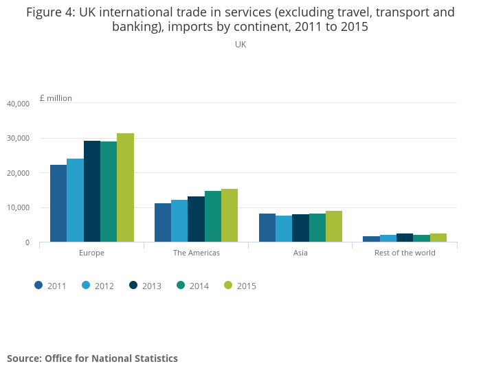 Total UK imports of services from Europe experienced the largest increase in 2015, rising from £29,085 million in 2014 to £31,483 million, an increase of 8.2%.
