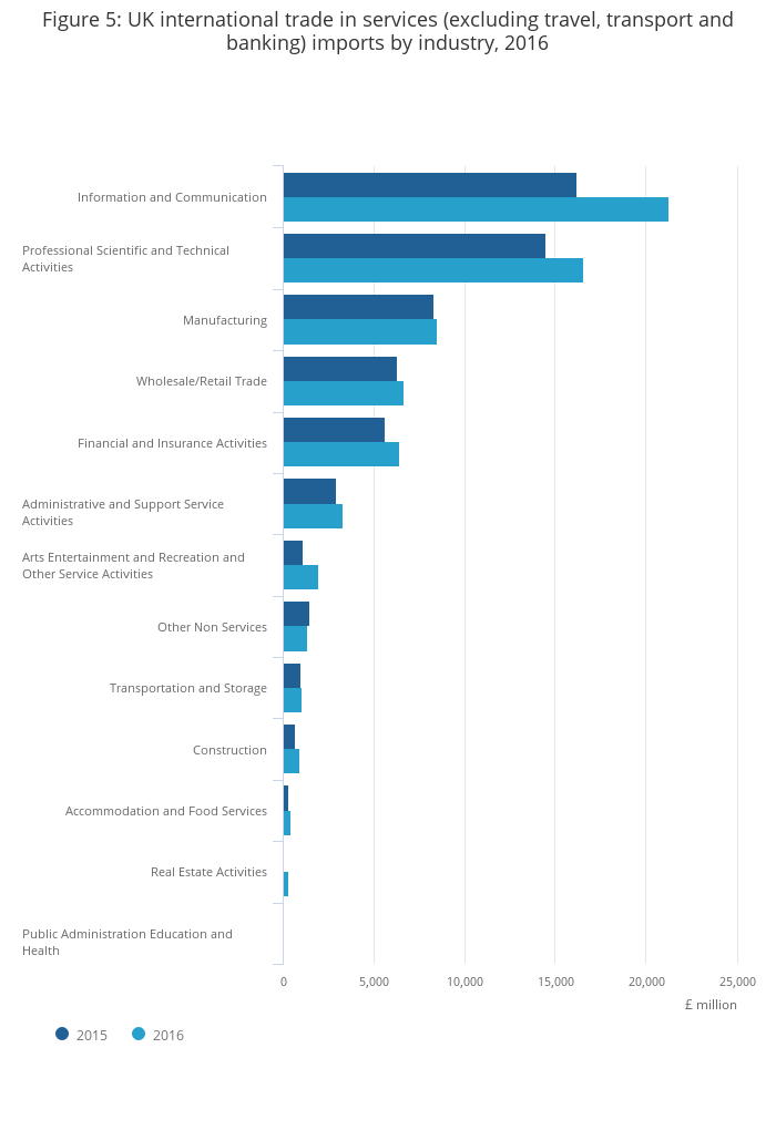 The information and communication industries have been the largest grouping in terms of importing services into the UK since 2013, with the value of imports reaching £21,241 million in 2016, or slightly below one-third of all services imports. The professional, scientific and technical activities industries were the second-largest grouping, with imports of £16,592 million in 2016, or slightly below one-quarter of total services imports.
