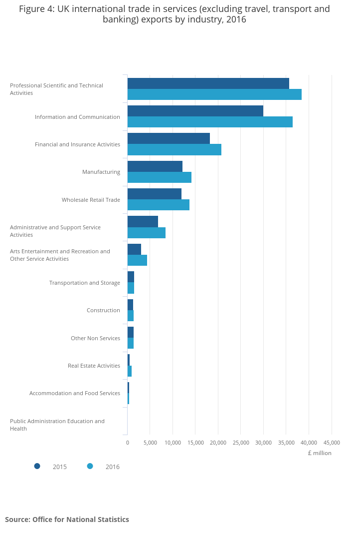 Over half of the UK’s total services exports (excluding the travel, transport and banking industries) were from businesses operating in the professional, scientific and technical (£38,503 million) and information and communication (£36,531 million) industries in 2016. The two industry groupings also reported the largest growth in 2016, with exports from the information and communication industries rising by £6,535 million, while exports from the professional, scientific and technical industries rose by £2,743 million.