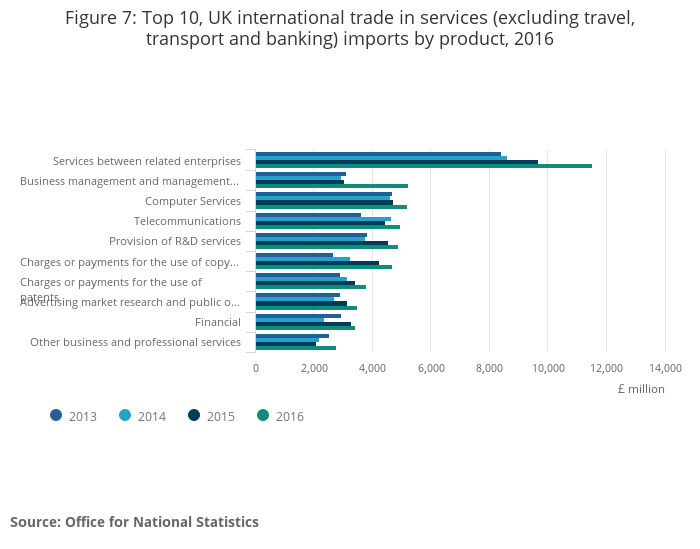 Total UK imports of services (excluding the travel, transport and banking sectors) have also followed an upward trend since the comparable time series began. UK services imports continued to increase in 2016, rising by £10,210 million to £68,718 million, an increase of 17.4%.