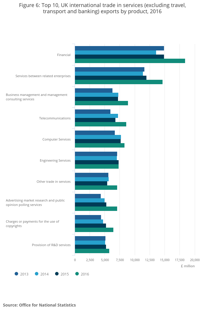 UK exports of financial services products made the largest contribution to the rise in 2016 increasing from £14.9 billion in 2015 to £18.4 billion.