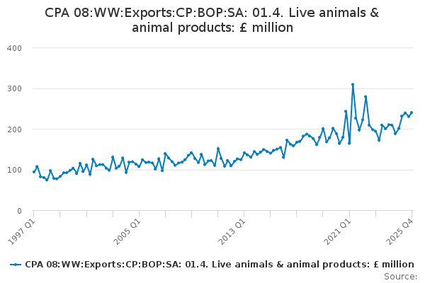 Download this time seriesCPA 08:WW:Exports:CP:BOP:SA: 01.4. Live animals & animal products: £ million