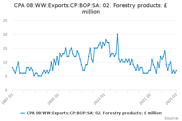Download this time seriesCPA 08:WW:Exports:CP:BOP:SA: 02. Forestry products: £ million