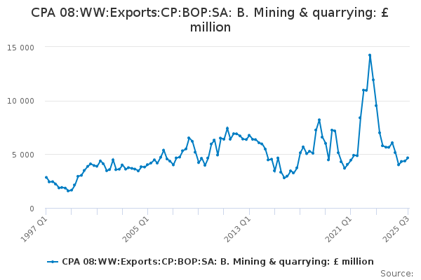 Download this time seriesCPA 08:WW:Exports:CP:BOP:SA: B. Mining & quarrying: £ million