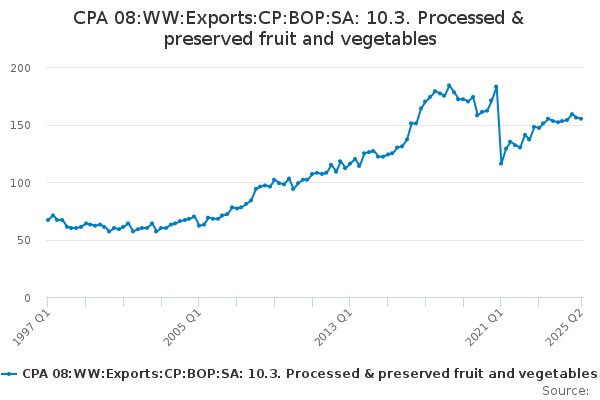 Download this time seriesCPA 08:WW:Exports:CP:BOP:SA: 10.3. Processed & preserved fruit and vegetables
