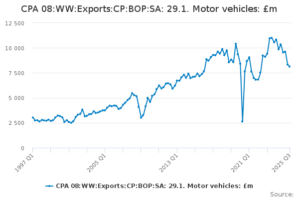 Download this time seriesCPA 08:WW:Exports:CP:BOP:SA: 29.1. Motor vehicles: £m