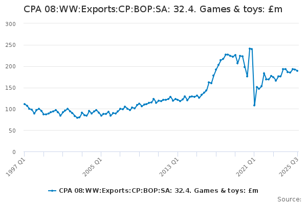 Download this time seriesCPA 08:WW:Exports:CP:BOP:SA: 32.4. Games & toys: £m