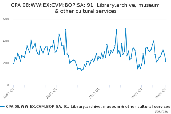 Download this time seriesCPA 08:WW:EX:CVM:BOP:SA: 91. Library,archive, museum & other cultural services