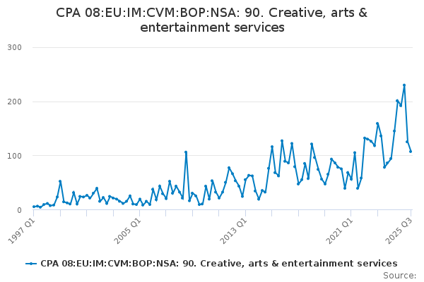 Download this time seriesCPA 08:EU:IM:CVM:BOP:NSA: 90. Creative, arts & entertainment services