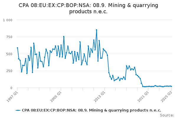 Download this time seriesCPA 08:EU:EX:CP:BOP:NSA: 08.9. Mining & quarrying products n.e.c.