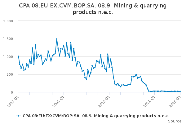 Download this time seriesCPA 08:EU:EX:CVM:BOP:SA: 08.9. Mining & quarrying products n.e.c.