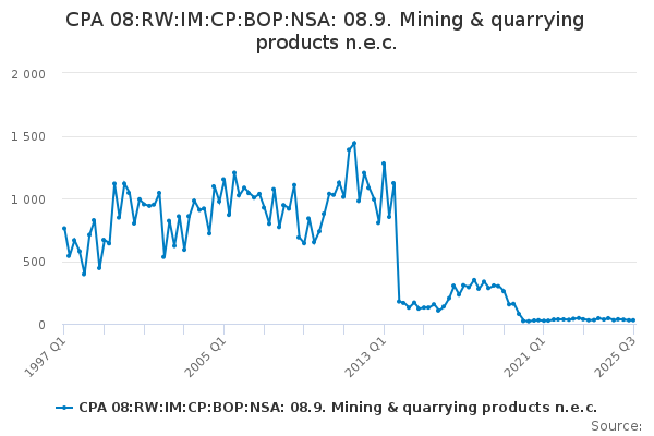 Download this time seriesCPA 08:RW:IM:CP:BOP:NSA: 08.9. Mining & quarrying products n.e.c.