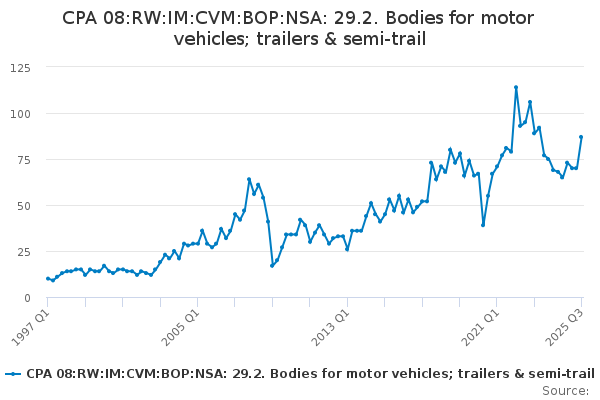 Download this time seriesCPA 08:RW:IM:CVM:BOP:NSA: 29.2. Bodies for motor vehicles; trailers & semi-trail