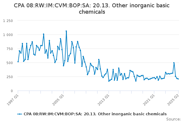Download this time seriesCPA 08:RW:IM:CVM:BOP:SA: 20.13. Other inorganic basic chemicals