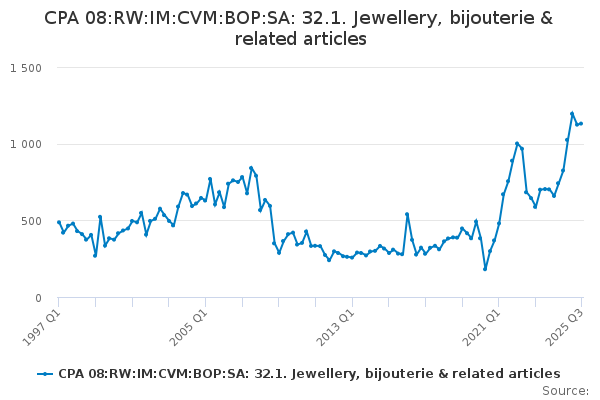 Download this time seriesCPA 08:RW:IM:CVM:BOP:SA: 32.1. Jewellery, bijouterie & related articles