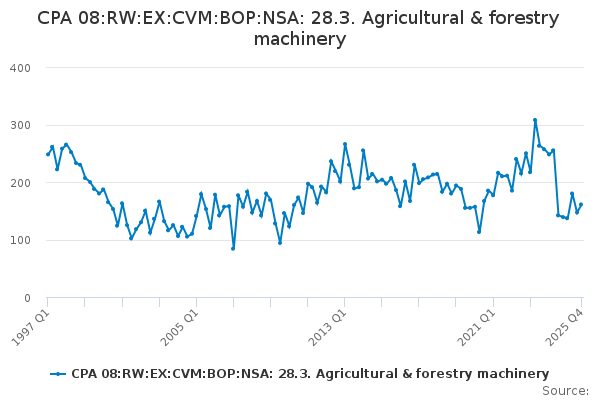 Download this time seriesCPA 08:RW:EX:CVM:BOP:NSA: 28.3. Agricultural & forestry machinery