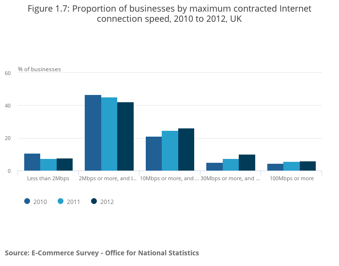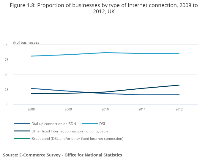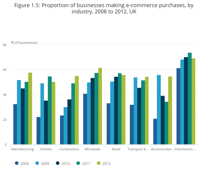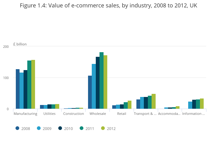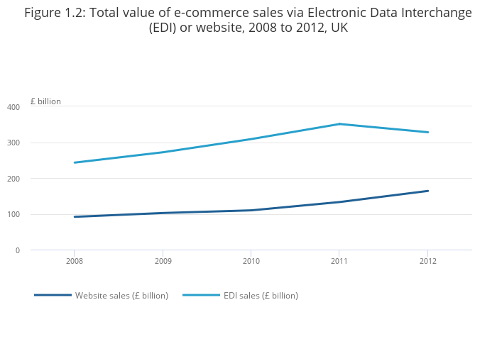 On an annual basis ONS publishes estimates of the values of e-commerce and the adoption of the use of ICT, taken from the annual UK e-commerce survey. The latest available estimates are for 20123.