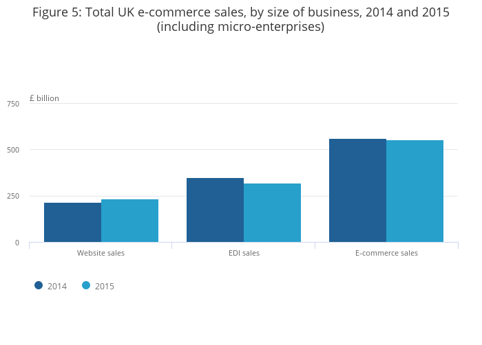 In 2015 micro-enterprises made total e-commerce sales of £21.2 billion. These consisted of £18.8 billion website sales and £2.4 billion Electronic Data Interchange (EDI) sales. Combining the e-commerce sales made by micro-enterprises with those made by businesses with 10 or more employees gave an overall value of e-commerce sales of £554 billion in 2015.