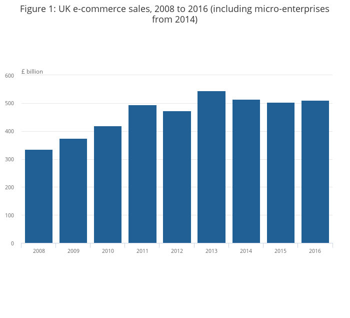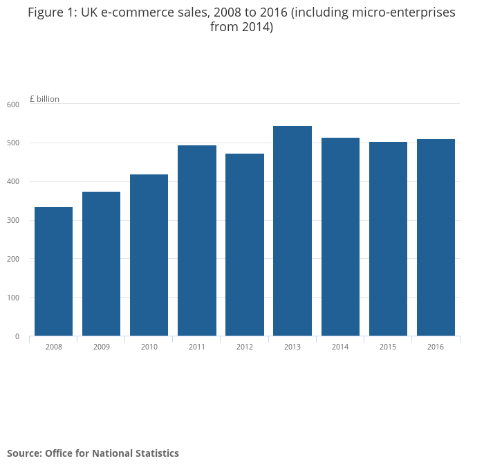 E-commerce sales by businesses in the UK non-financial sector were £511 billion in 2016, up from £503 billion in 2015.