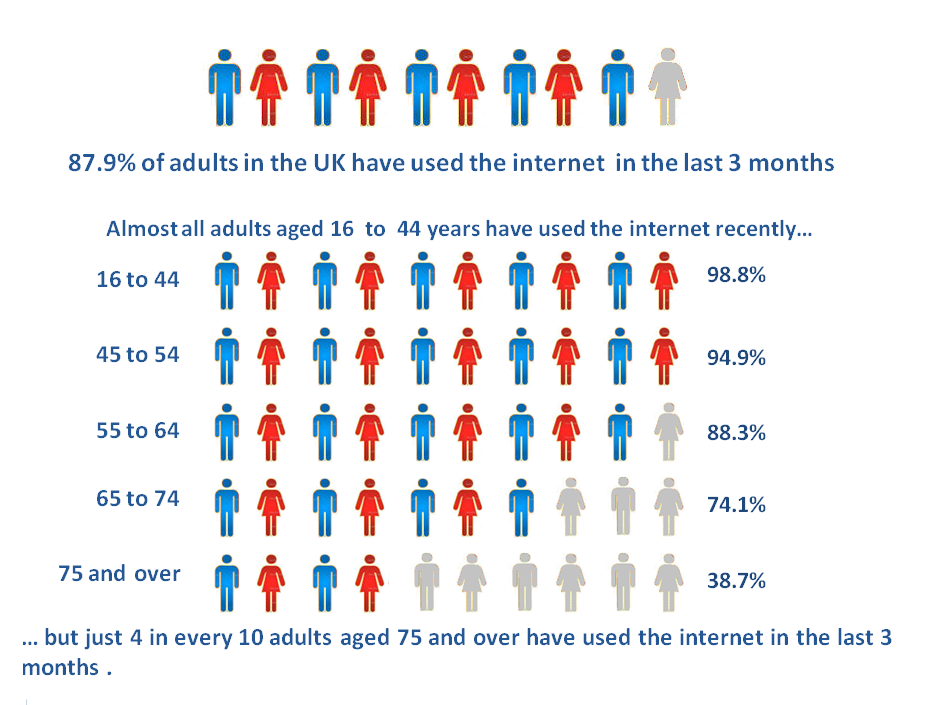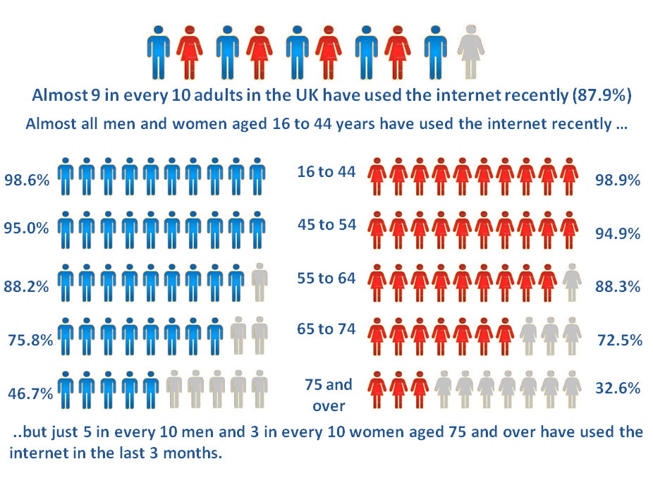Recent internet use for adults aged 65 and over has increased since 2011 and we have provided new analysis on recent internet use by economic activity (Tables 7A and 7B in the internet users dataset).
