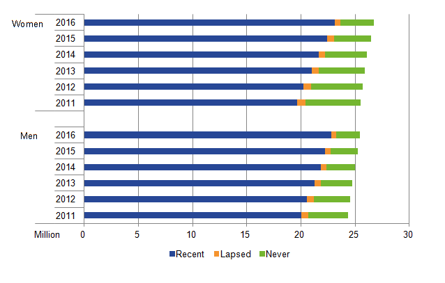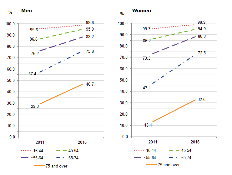 Women aged 75 and over, had seen the largest rise in recent internet use, up 169.0% from 2011; however, still less than a third (32.6%) were recent users in 2016.