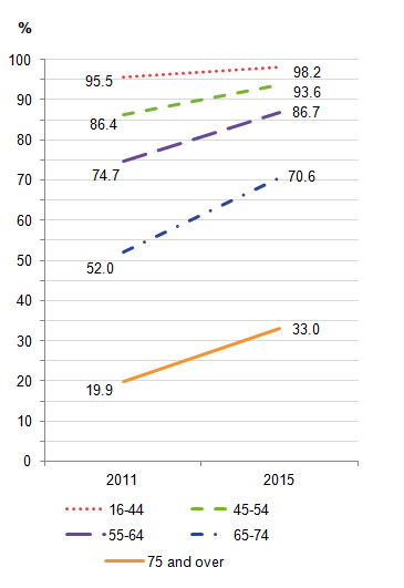Recent internet use in the 65 to 74 age group has increased by 68.7% since 2011. Since 2015, there has been an increase of 7.5% in the same age group.