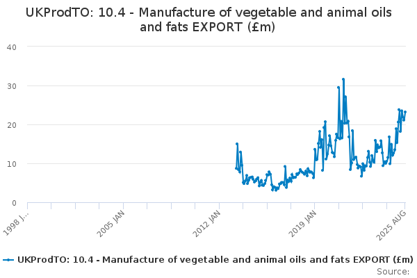 Download this time seriesUKProdTO: 10.4 - Manufacture of vegetable and animal oils and fats EXPORT (£m)