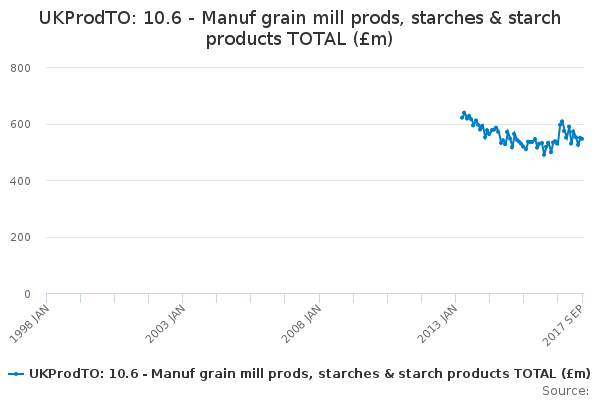 Download this time seriesUKProdTO: 10.6 - Manuf grain mill prods, starches & starch products TOTAL (£m)