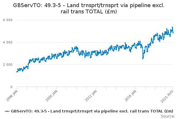 Download this time seriesGBServTO: 49.3-5 - Land trnsprt/trnsprt via pipeline excl. rail trans TOTAL (£m)