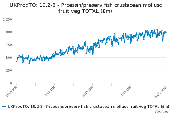 Download this time seriesUKProdTO: 10.2-3 - Prcessin/preserv fish crustacean mollusc fruit veg TOTAL (£m)