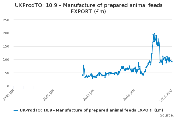 Download this time seriesUKProdTO: 10.9 - Manufacture of prepared animal feeds EXPORT (£m)
