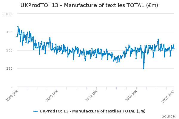 Download this time seriesUKProdTO: 13 - Manufacture of textiles TOTAL (£m)