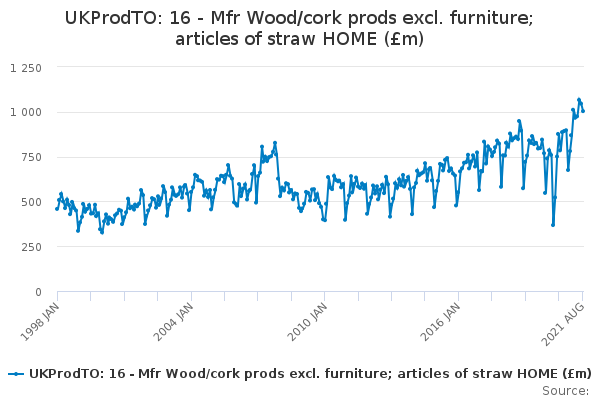 Download this time seriesUKProdTO: 16 - Mfr Wood/cork prods excl. furniture; articles of straw HOME (£m)