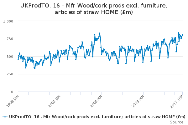 Download this time seriesUKProdTO: 16 - Mfr Wood/cork prods excl. furniture; articles of straw HOME (£m)