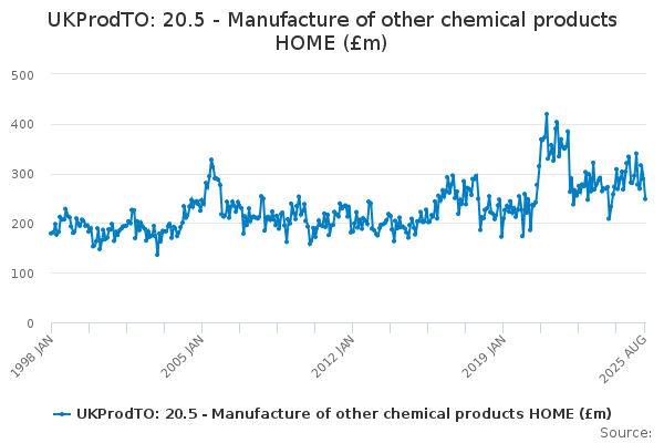 Download this time seriesUKProdTO: 20.5 - Manufacture of other chemical products HOME (£m)