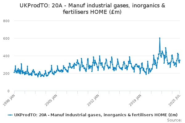 Download this time seriesUKProdTO: 20A - Manuf industrial gases, inorganics & fertilisers HOME (£m)