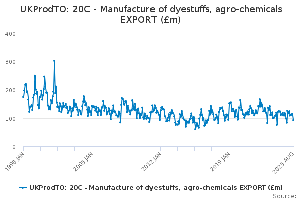 Download this time seriesUKProdTO: 20C - Manufacture of dyestuffs, agro-chemicals EXPORT (£m)