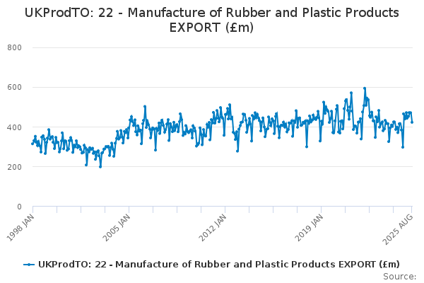 Download this time seriesUKProdTO: 22 - Manufacture of Rubber and Plastic Products EXPORT (£m)